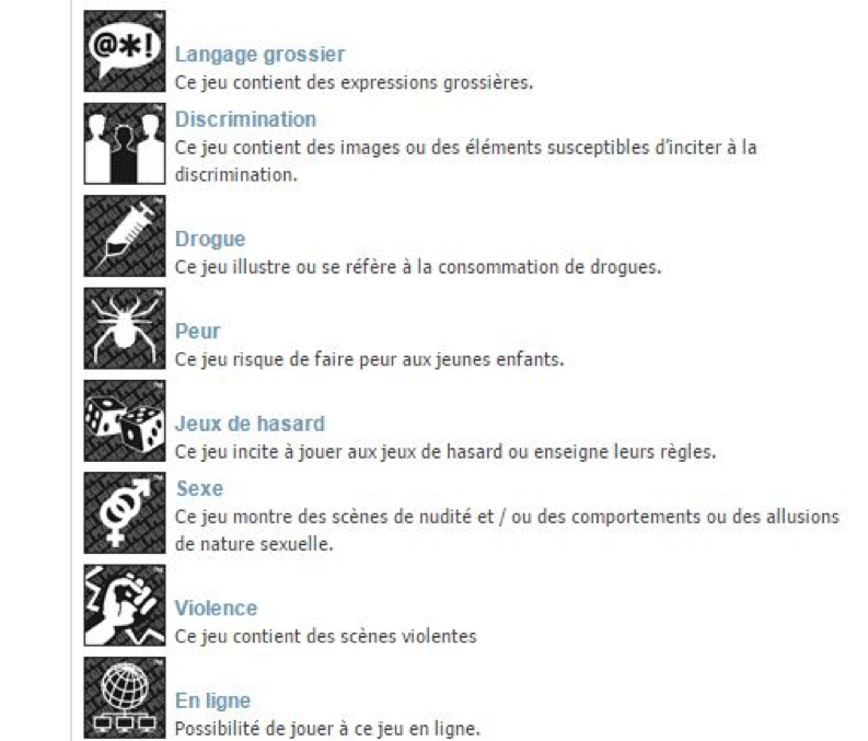 Le système PEGI propose également une évaluation des jeux vidéo en termes de description des contenus :